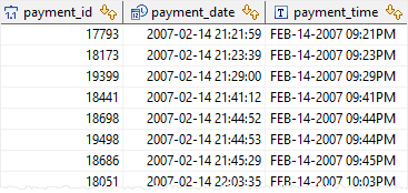 The following statement uses the TO_CHAR() function to format the payment date that consists of hours, minutes, and seconds: