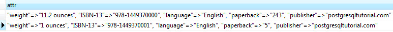idis the primary key that identifies the book.titleis the title of the productsattrstores attributes of the book such as ISBN, weight, and paperback. The data type of theattrcolumn is hstore.